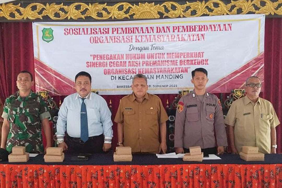 Sosialisasi Pembinaan dan Pemberdayaan Organisasi Kemasyarakatan dengan tema ‘Penegakan Hukum untuk Memperkuat Sinergi Cegah Aksi Premanisme Berkedok Organisasi Kemasyarakatan’, digelar di Pendopo Kecamatan Manding, Selasa (20/05/2025).