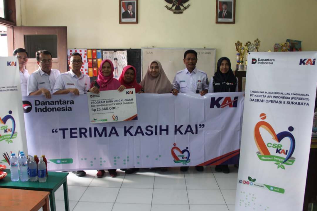 Kali ini, KAI Daop 8 Surabaya memberikan bantuan Corporate Social Responsibility (CSR) renovasi sekolah kepada TK Yayasan Wanita Kereta Api (YWKA), yang berlokasi di Jl. Sidotopo Lor No. 12, Sidotopo, Kecamatan Semampir, Surabaya, guna menciptakan lingkungan belajar yang lebih nyaman dan aman bagi para murid.